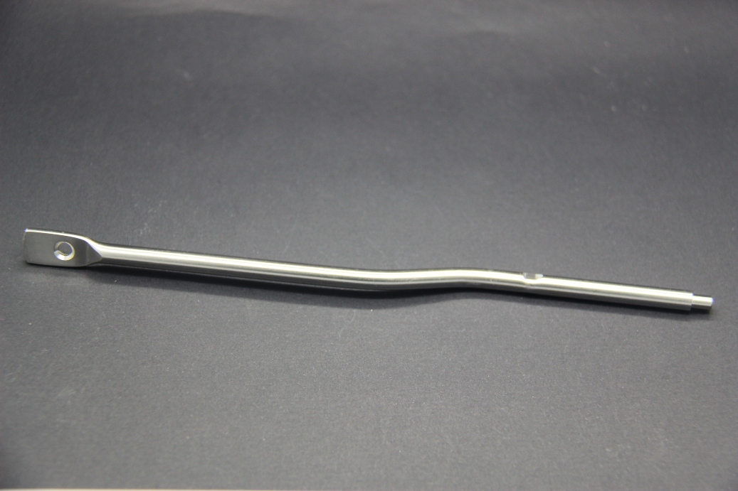 このロッドは、ステンレスSUS304Lを使用した自動車エンジン制御用ロッドと呼ばれる製品です。ロッドの先端部にはピンを取り付ける穴があり、非常に高い精度が求められています。その為、ロッドを曲げ加工した後に、精密シャフト.comでは取付部の仕上加工を実施しています。また、取付け部は直角度0.01、 平面度0.008が求められており、これらの確保するために、加工治具の管理も行いながら日々加工を行っています。